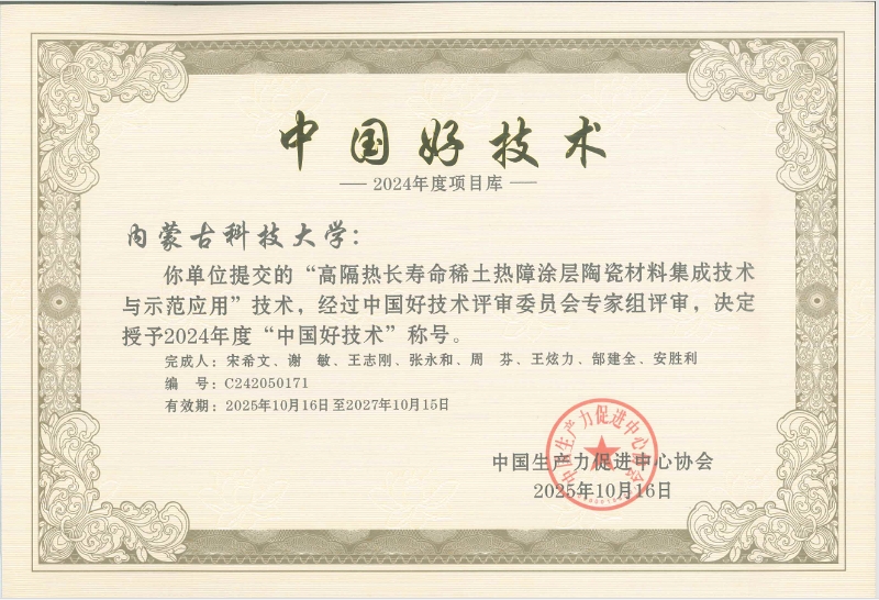 “中国好技术”评选由中国生产力促进中心协会组织,旨在发掘贴近生活、惠及民生、具备显著产业化前景的创新技术成果。入选技术解决了EB-PVD稀土陶瓷靶材密度分布不均匀、残余应力大、成型质量差和成品率低等技术难题,攻克了高均质稳定稀土热障涂层材料设计与调控关键技术,打破了国外技术封锁与垄断局面。
